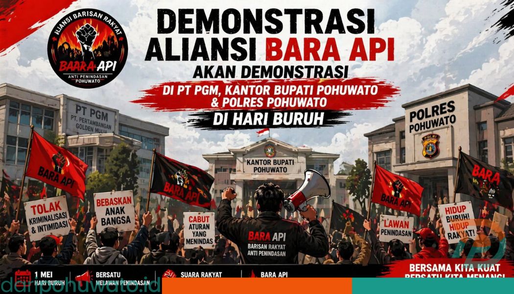 Daripohuwato.idRencana aksi besar yang akan digelar Aliansi Barisan Rakyat Anti Penindasan (BARA API) di Kabupaten Pohuwato mulai menghangat. Massa dijadwalkan turun di tiga titik, yakni di area anak perusahaan PT PGM, Kantor Bupati Pohuwato, dan Polres Pohuwato.