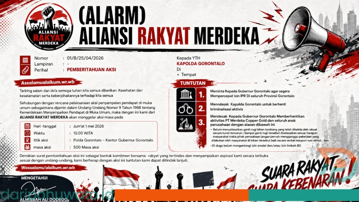 Daripohuwato.id – Aliansi Rakyat Merdeka (ALARM) resmi melayangkan surat pemberitahuan aksi unjuk rasa yang akan digelar pada Jumat, 1 Mei 2026, pukul 10.00 WITA.