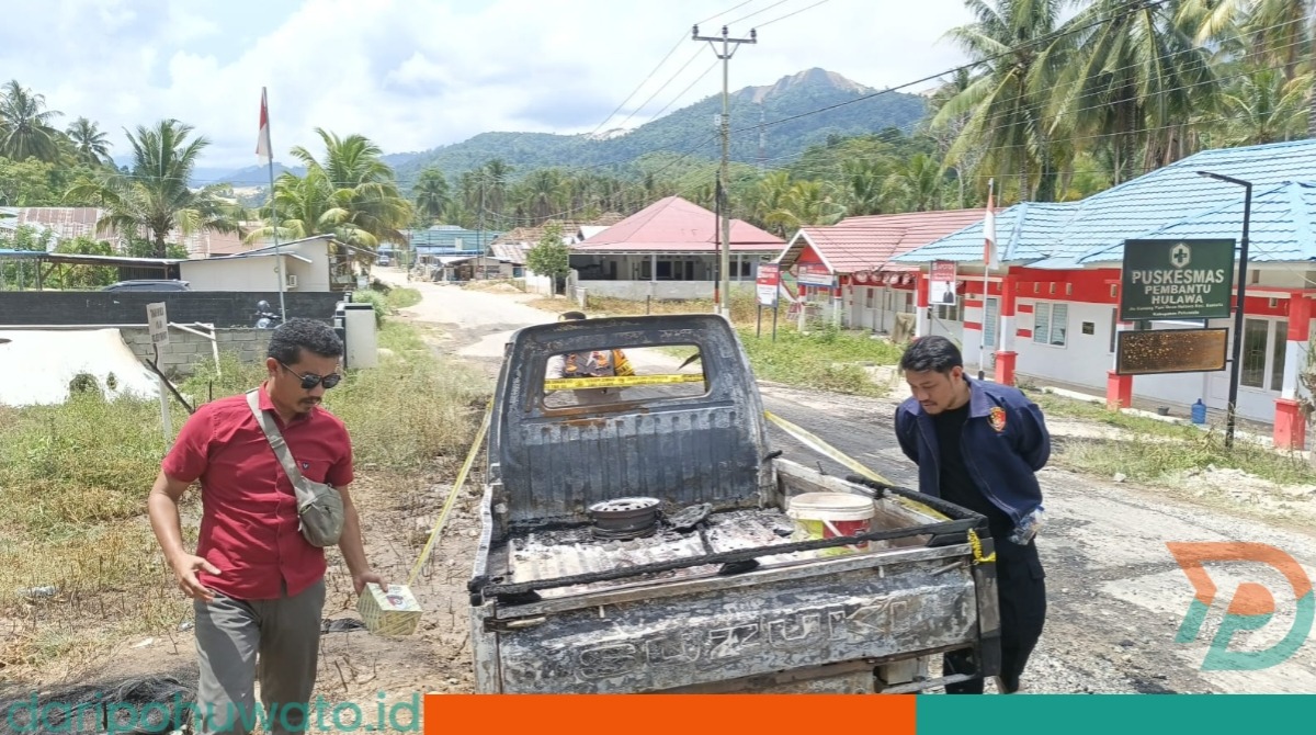 Daripohuwato.id – Kepolisian Resor (Polres) Pohuwato menindaklanjuti laporan masyarakat terkait kebakaran satu unit mobil jenis Suzuki Carry berwarna hitam tanpa nomor polisi di depan Kantor Desa Hulawa, Kecamatan Buntulia, Kabupaten Pohuwato, Minggu (12/4/2026) sekitar pukul 12.30 WITA.